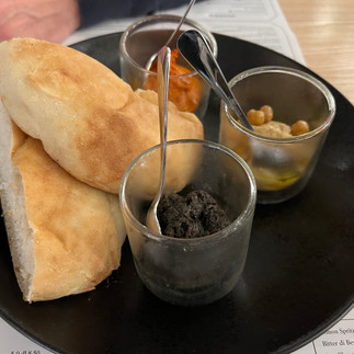 Aus der Karte, die auf dem Tischset abgedruckt war, wurden folgende Speisen geordert. Zum Starten gönnten sich Hans und Paul Hummus, Ajvar (Mischung aus Paprika und Auberginen) und Olivenpanade mit Lepinja Brot (Fladenbrot). Das Vorspeisegericht haben wir, ganz modern, geteilt. Bei den Hauptgängen fiel die Wahl auf die frischen Steinpilzravioli mit Salbeibutter und Belper Knolle sowie auf ein Gericht aus der Tageskarte – Black Tiger mit Risotto und Spargeln.