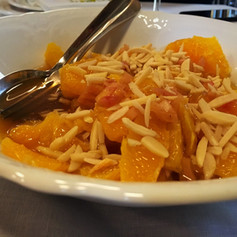 Eine salzige Crema Catalan bestehend Geisskäse und Vanille begleitet mit einem Orangensalat.